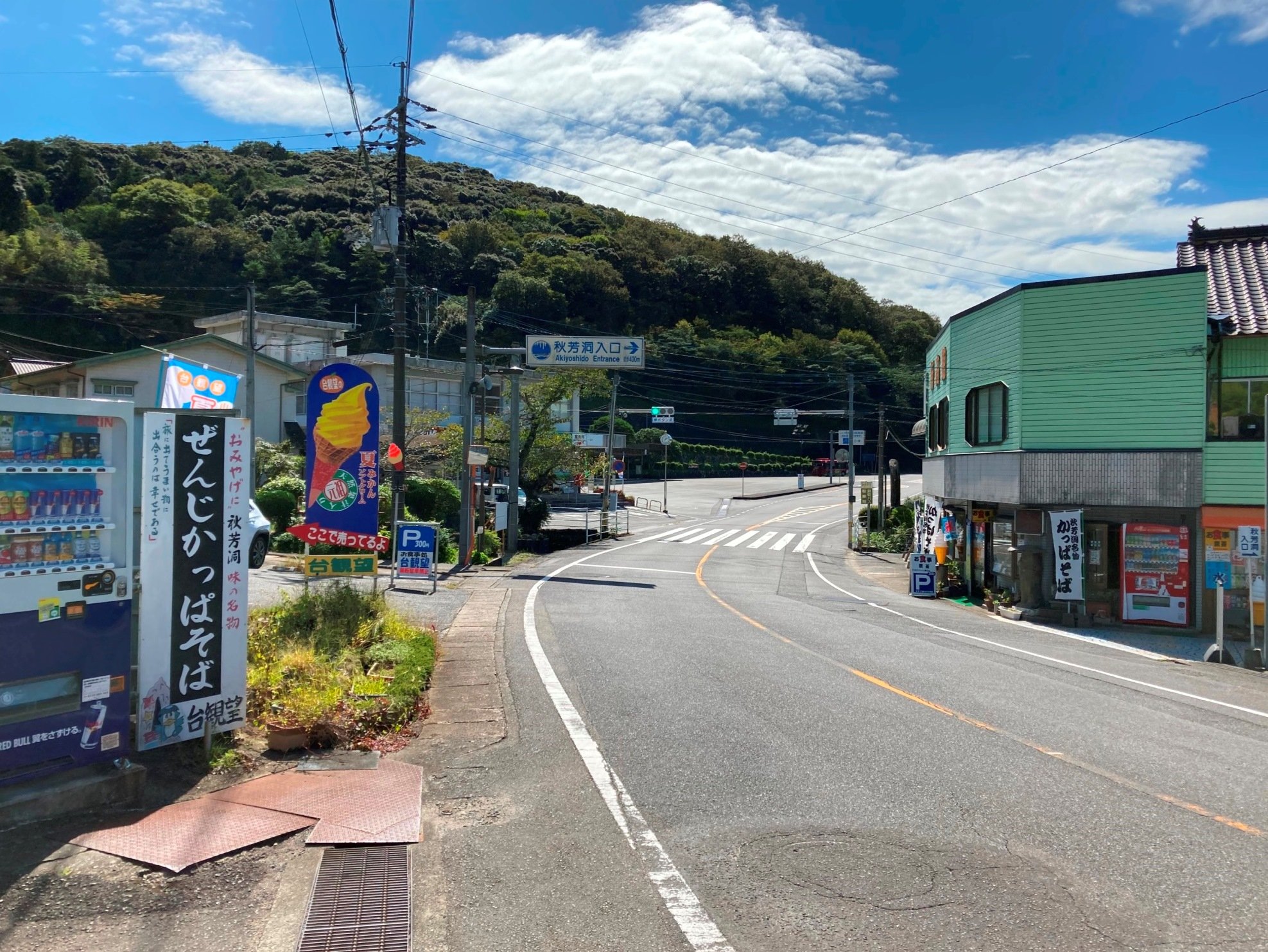 ↓バスセンターから秋吉台・秋芳洞への道(この先は秋芳洞入口なので、途中右手の車道へ出る)