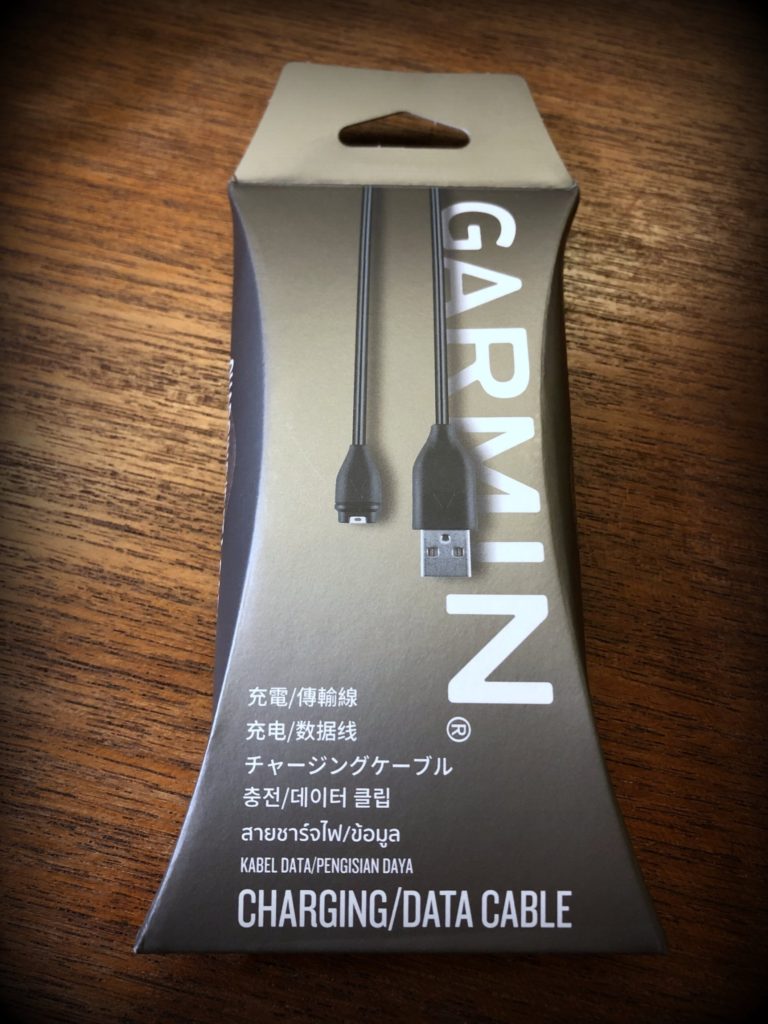 Amazonから早速Garminの充電ケーブルが届きました。早い!!パッケージを見て思いましたが、このケーブルは充電用だけでなくデータ転送用としても使いますね。やはり純正品が安心です。