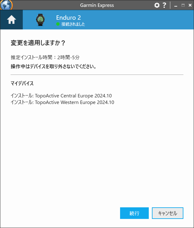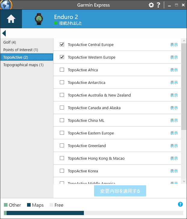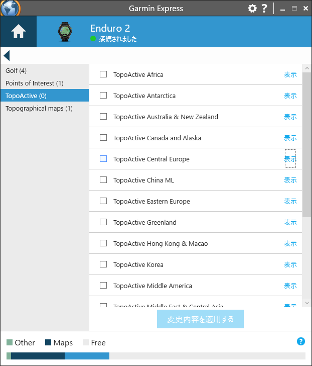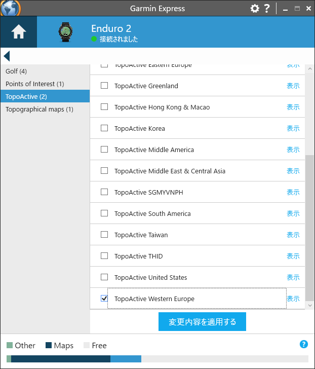 初期設定では時計にヨーロッパのOpen Street Mapが入っておらず、等高線や道路など何も表示されないので、このタイミングでフランス・スイス・イタリアの地図をインストールしました。