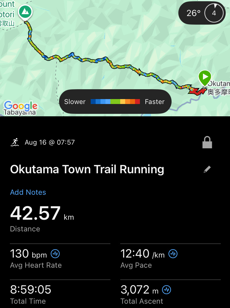 昨日はラッキーなことに気温が低めで、体がよく動きました。結果は往復で8時間59分。ついに9時間切り!これは正直かなり嬉しかったです。もちろんトレーニング効果も少しはあると思いますが、一番の要因はやっぱり気温。涼しさに助けられました。