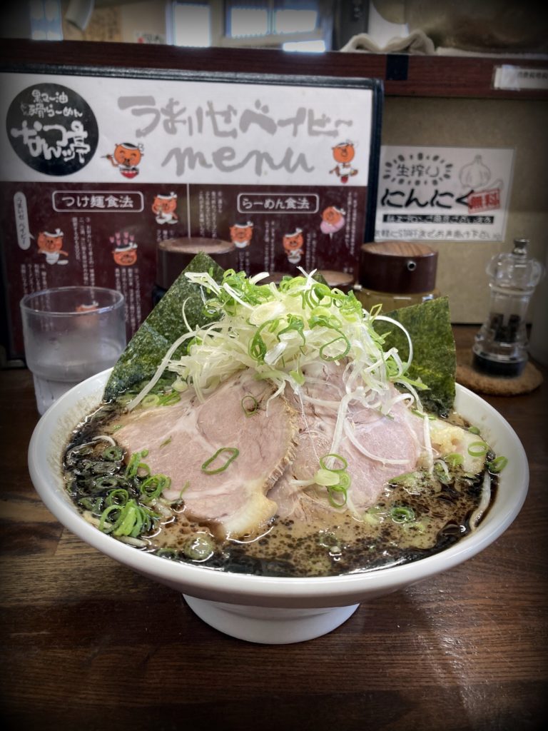 黒いスープに分厚いチャーシュー、山盛りの白髪ねぎ。秦野にあるラーメン店「なんつッ亭」本店の一杯です。
