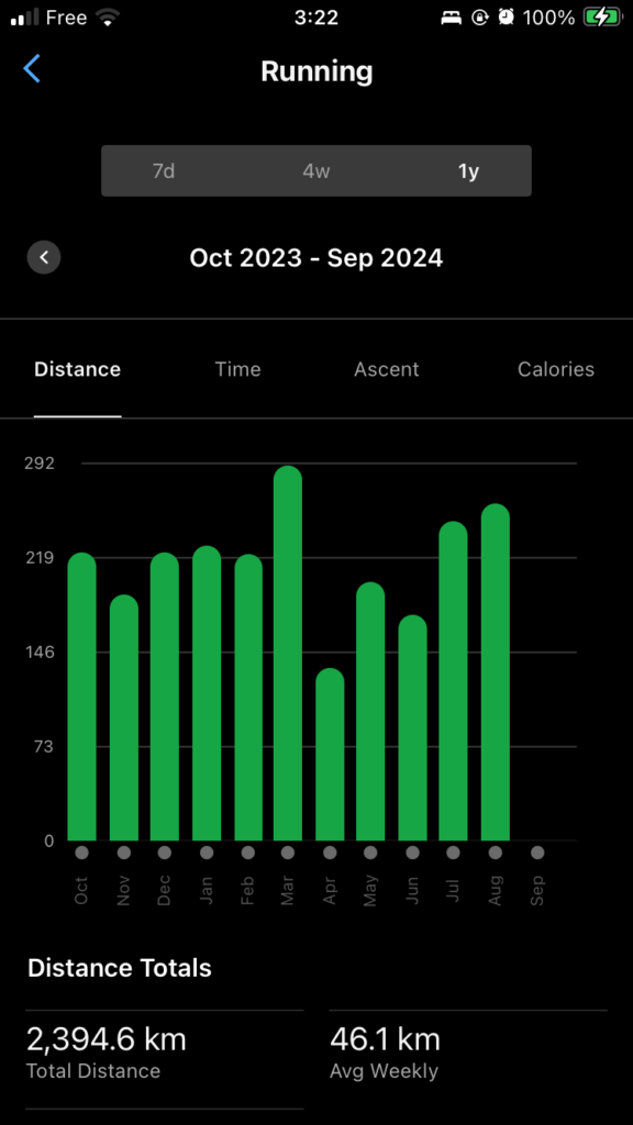 Garminのデータを振り返ると、走行距離、累積標高、スイムトレーニングが月ごとに変動しています。特に、今年3月は走行距離と標高がピークに達していることが確認できます。これは彩の国100マイルに向けてかなり練習量を増やした結果です。ただ、走り過ぎた結果、Too muchだったようで腰を痛めて走れなくなり、逆に4月は練習量は半減となりました。